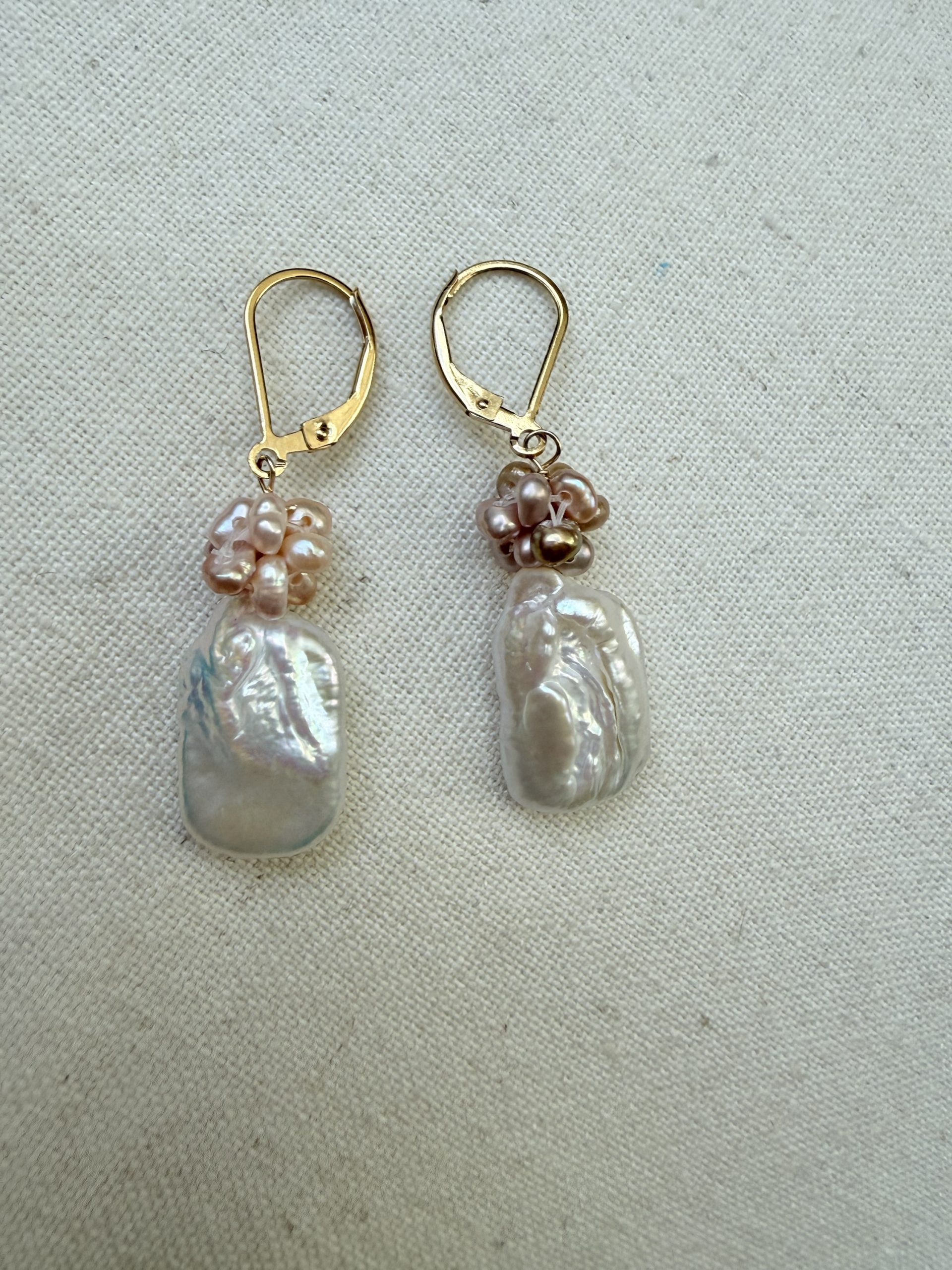 Boucles d’oreilles en Gold filled/ or laminé 5 microns monture dormeuse, Perles baroques, rectangulaires 23 mm surmontées d’une grappe de perles de culture baroques roses 8 mm environ