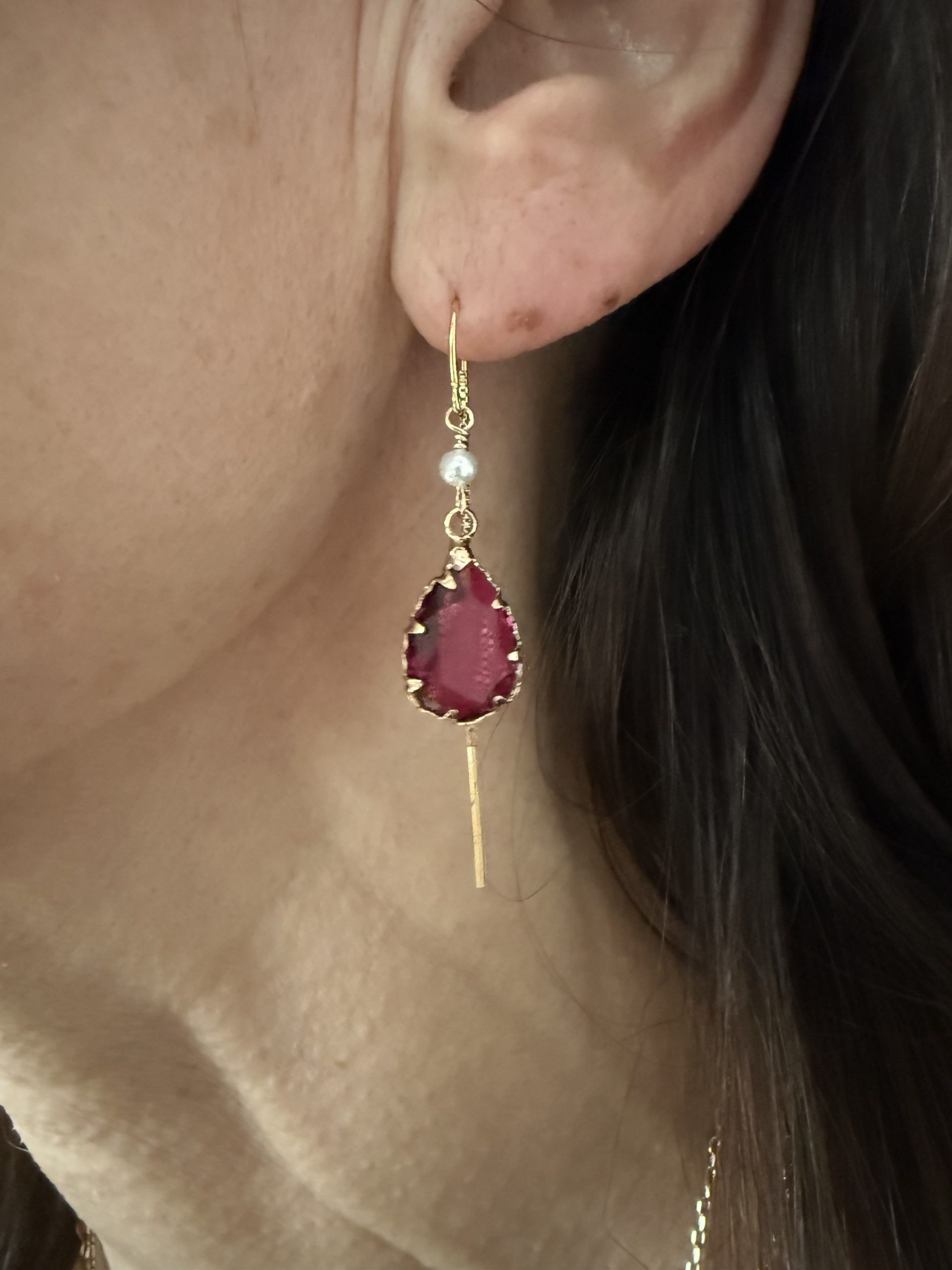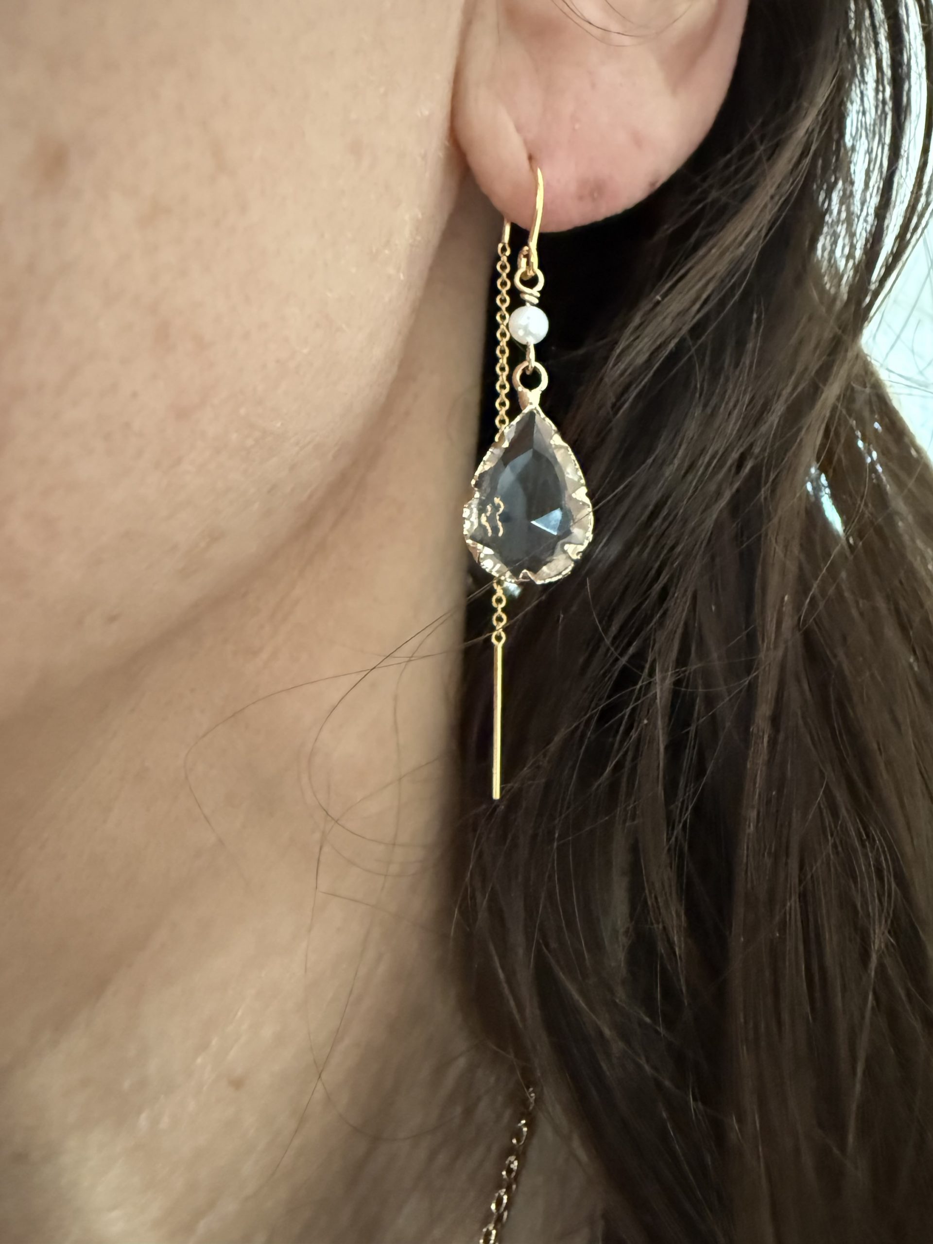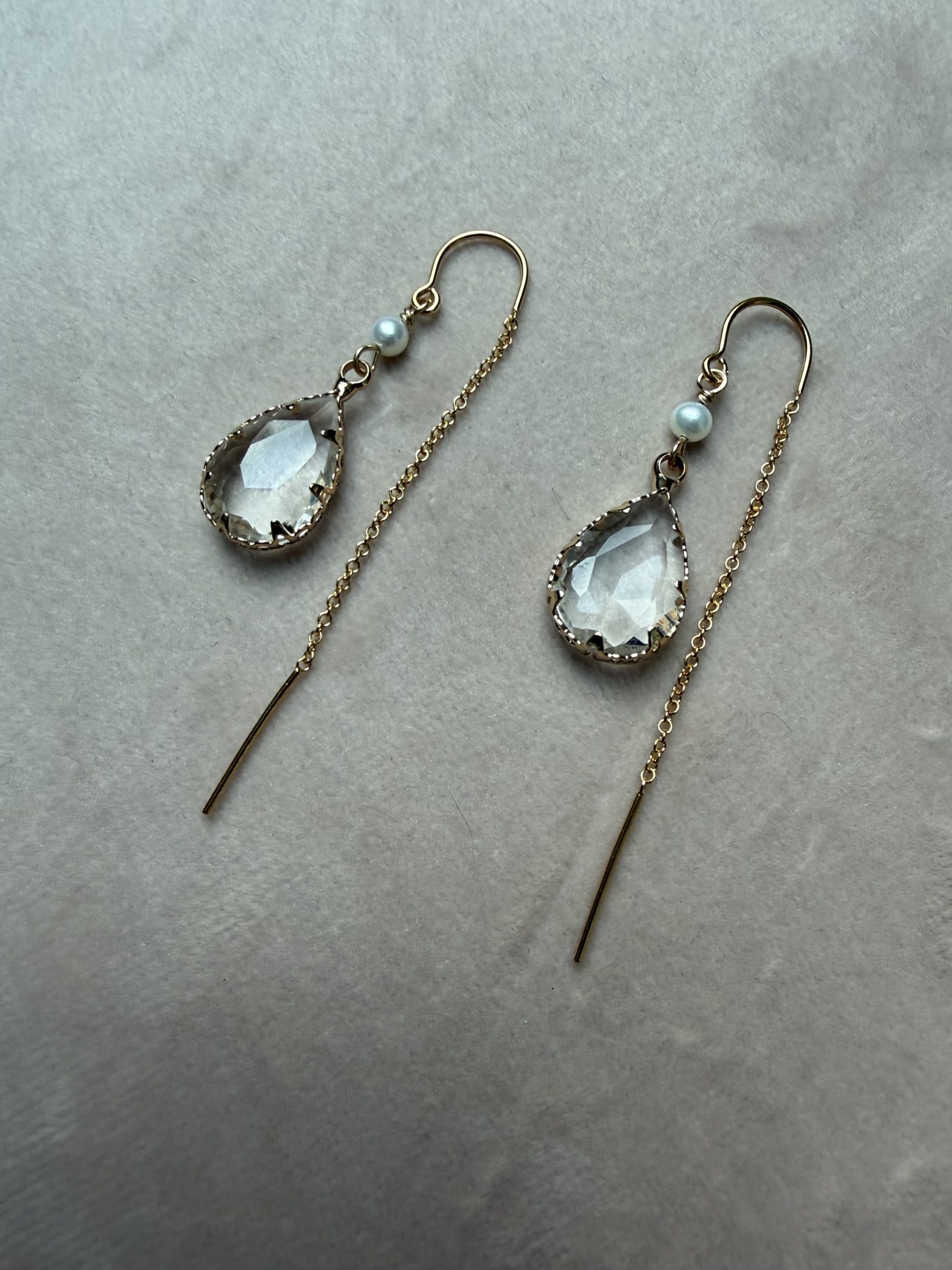 Boucles d’oreilles, monture fils d’oreille en Gold filled /or laminé 5 microns et pendentif Cristal forme poire 10 × 15 mm et mini perle de culture 3 mm, longueur pendentif Total 3 cm