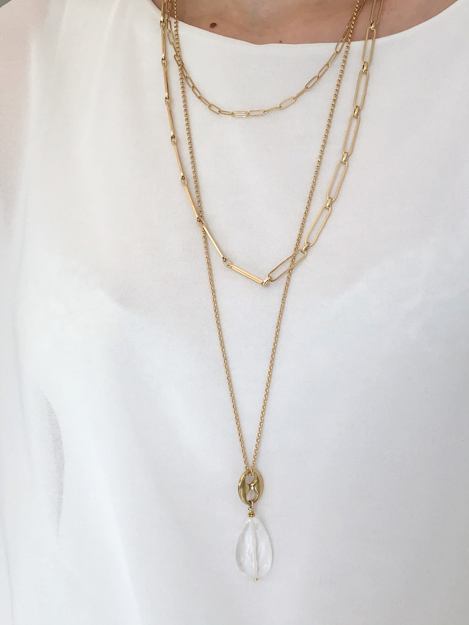 Ornements : pendentif maille marine en plaqué or et une pierre naturelle au choix cristal de roche ou quartz rose.